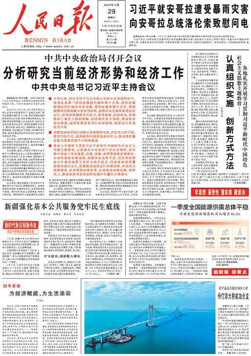《人民日报》2023年4月29日第1版 ■ 今年以来,在以习近平同志为核心的党中央坚强领导下,各地区各部门更好统筹国内国际两个大局,更好统筹疫情防控和经济社会发展,更好统筹发展和安全,我国疫情防控取得重大决定性胜利,经济社会全面恢复常态化运行,宏观政策靠前协同发力,需求收缩、供给冲击、预期转弱三重压力得到缓解,经济增长好于预期,市场需求逐步恢复,经济发展呈现回升向好态势,经济运行实现良好开局