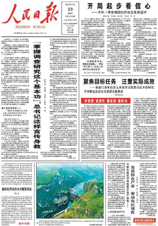 《人民日报》2023年4月23日第1版 湖北武汉——大雨滂沱,积水没过脚面,卷起裤腿,打着雨伞,向新港工作人员了解物流情况; 青藏高原——穿峡谷、过隧道、跨大桥,登上火车实地察看拉林铁路沿线建设情况,更放眼广袤西部边疆铁路网建设; 山东东营——在黄河入海口码头,凭栏远眺,“今天来到这里,黄河上中下游就都走到了,我心里也踏实了。” ………… 顶风雪、踏泥泞、听真话、察真情,党的十八大以来,