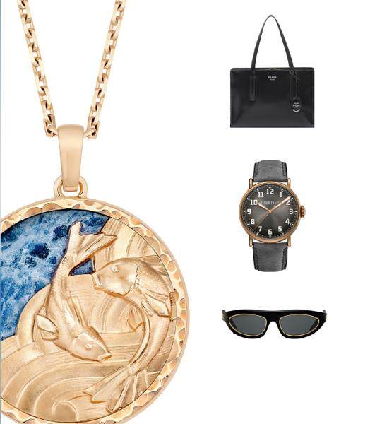 Van Cleef & Arpels 梵克雅宝 Zodiaque Piscium(双鱼座)长项链 玫瑰金, 方钠石 Prada手袋 / H. MOSER & CIE.亨利慕时 传承者“Since 1828”青铜腕表 / GUCCI墨镜 谁说只有在夜里才能观星辰?Van Cleef & Arpels梵克雅宝凝望天际,把无边星海化为臻品,勾起无垠意象。掌握宇宙神秘的力