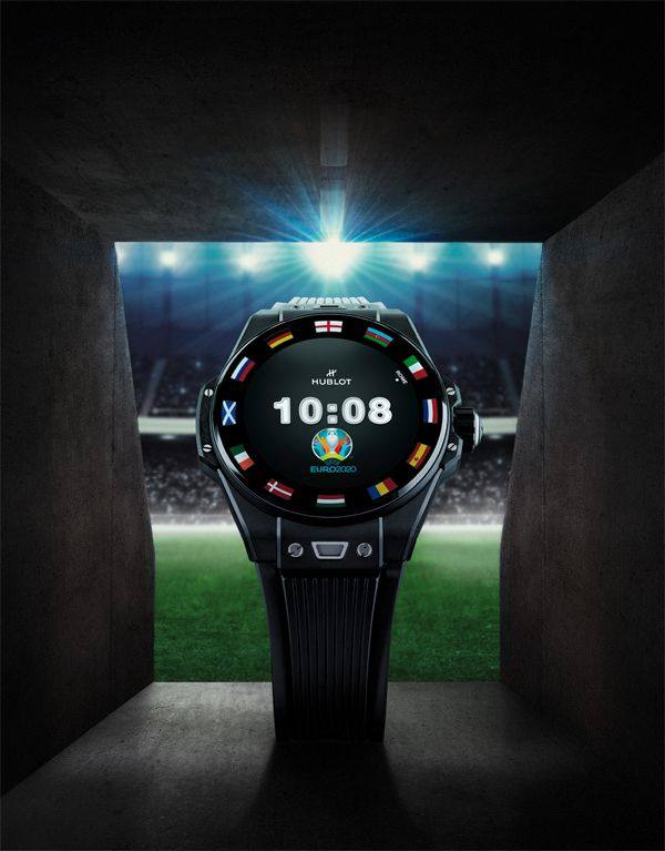 与欧洲杯同在时刻 为庆祝2020欧洲杯™赛事燃情开赛,Hublot宇舶表耀目发布 2020欧洲杯TM智能腕表,通过腕间的个性化虚拟体育场,再次为球迷朋友们奉上非凡的实时观赛体验。早在2018年俄罗斯世界杯TM期间,品牌便开始为球迷们提供这一卓尔不凡的观赛体验。今次,宇舶表携限量发售1,000枚的升级版智能腕表强势回归,进一步提升球迷的观赛体验。 2020欧洲杯TM智能腕表的表圈采用