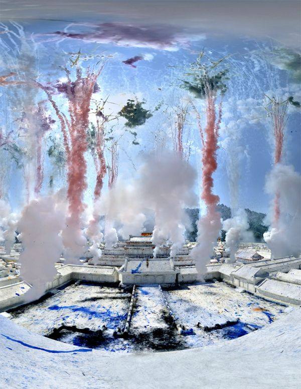 虚拟现实作品《梦游紫禁城》静帧蔡工作室提供 通过VIVE Arts的前沿科技手段,蔡国强想象了紫禁城建成时的一场白日烟花仪式。戴上VR头盔后,观众将穿过时空隧道,进入汉白玉雕琢的空白紫禁城。蔡国强标志性的火药作品以及大型装置的沉浸式与参与性,与虚拟现实科技的特性亦形成共鸣。他的首个VR作品,以火药这一古老的媒介,去挑战VR的调试性、可控性和精巧性,并将工匠手工雕琢的温度和难以控制的烟花爆破,融入