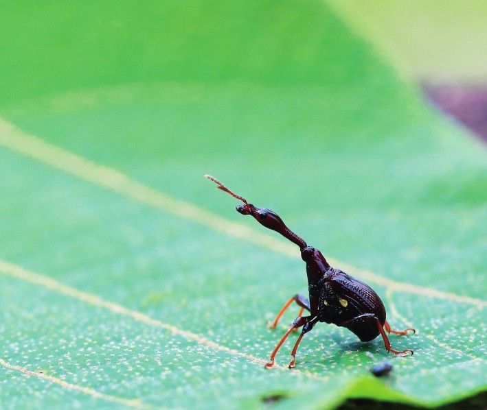 象鼻虫其实很常见,例如米象,或许家家都有。它们的虫卵潜藏在米中,时机一成熟就会孵化出来。看到有活物在爬,我们才发现它们。只是一般人不叫它们这个名字,北方有人叫它们“牛子”—它们行动慢吞吞的,像老牛走路,头上的两根触角也像牛犄角。那么小,也看不太清,又不是专业的研究人员,谁会拿出放大镜细细观察呢? 今天在山里拍到棕长颈卷叶象鼻虫,和米象同目,只是体形大多了。这个名字比较直观,乍一看