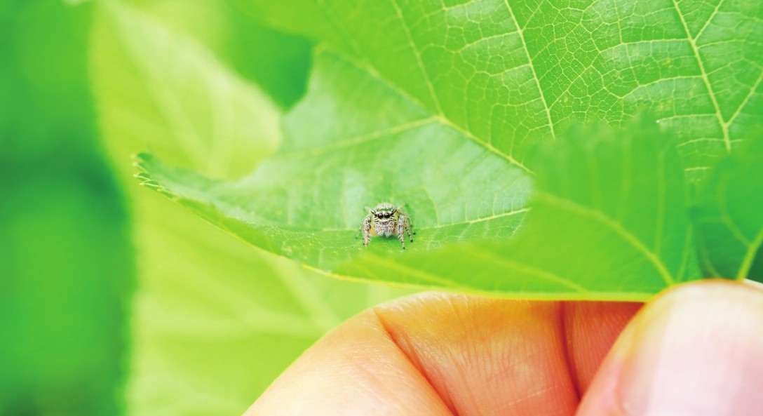 跳蛛是“微距明星”,我越来越喜欢它们了。 原因之一是它们小,太小了,小到一般人看不见。草叶上,一个小黑点儿,一闪,不见了,谁会在意呢?跳蛛胆子很小,很机警,我的镜头靠近它,它先是退着走;再靠近些,它就会转到叶子下面去;再逼近一些,它就发挥它的特长,跳走了,可能跳到另一片叶子上,也可能直接跳到地上了。跳蛛虽不结网捕猎,但还是会拖着一根蛛丝,保护自己,就像高空表演的杂技演员腰上系的那