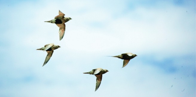 毛腿沙鸡是一种体形大小与鸽子相仿的飞鸟,栖息于西起地中海沿岸,东至中国吉林的荒漠、半荒漠地区的广大区域,通常成群结队贴地飞行,以觅食植物种子、浆果和嫩叶为主。 每年4月至7月是沙腿毛鸡的繁殖季,亲鸟会产卵2~4枚,孵化期为22~27天。雏鸟孵化出壳后,还需要经过数周时间哺育才能展翅飞翔,在此期间不能自行寻找食物和水。 荒漠中最珍贵的不是食物,而是水。每到清晨和黄昏时分,毛腿沙鸡会长途飞行到水源