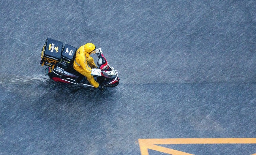 ▋在瓢泼大雨中送餐的外卖员 一 在我刚加入外卖行业时,队长考虑到我是新手,请站长给我设置了“1单”的接单上限,也就是只有当我完成了手上的订单后,才能接到新的订单。 这对刚入行的我来说当然是一件好事,我有充分的时间去熟悉道路、商家和各大单位与小区的位置。我还记得接到属于我的第一单时的状况。那是一位住在水利局宿舍里的老年人,点了一份粥和一笼蒸饺。在楼下,我跟着这栋楼里的住户进了单元门