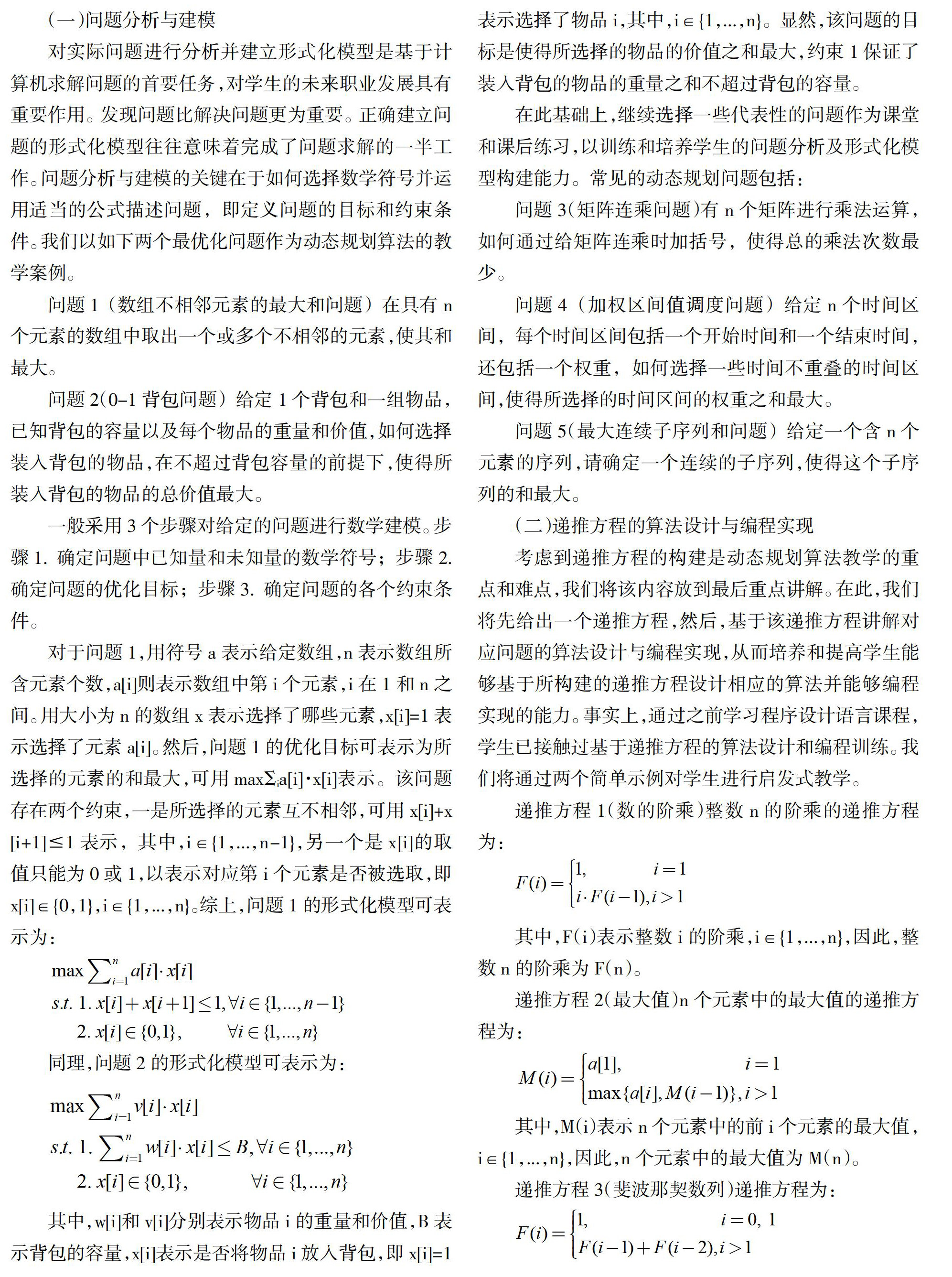 摘 要:问题解决能力是目前学生亟待提升的能力之一。围绕动态规划算法教学,介绍了一种以问题解决能力目标为导向的教学设计,通过调整教学内容和教学过程,突出学生问题解决能力的培养和训练,为能力目标导向的课程改革提供了一种新思路。 关键词:问题解决能力;动态规划;算法设计;教学设计 中图分类号:G642 文献标志码:A 文章编号:2096-000X(2021)11-010