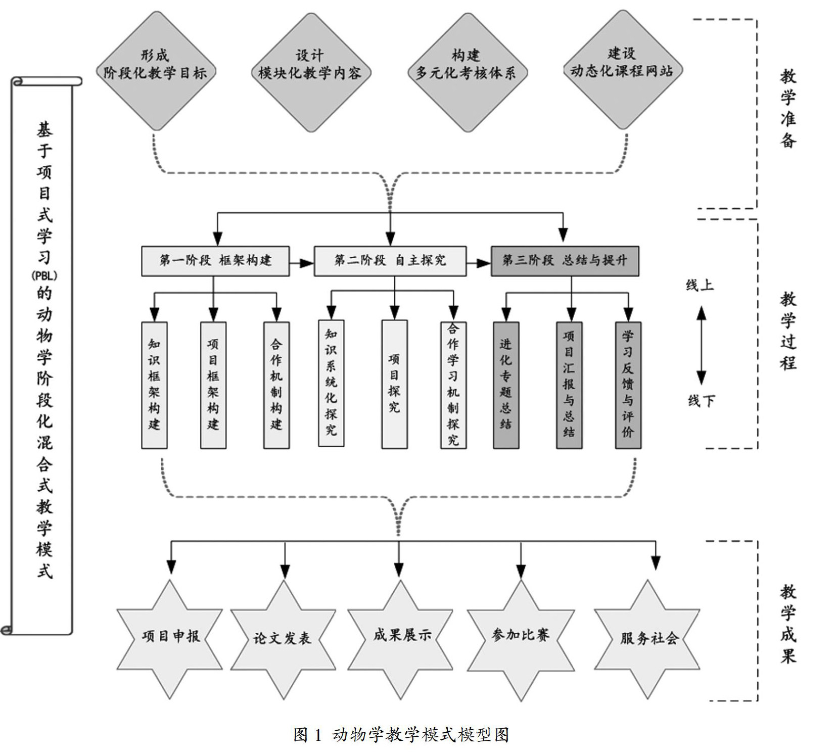 摘 要:基于项目式学习(Project-Based Learning, PBL)是基于建构主义理论的学习模式,是国内外高校培养学生综合实践能力以及高阶思维的重要渠道,目前被广泛采用。以创新性师范生培养为目标,我校动物学课程在教学改革过程中注重对于阶段化认知与发展规律的应用,采用PBL教学模式,并将该模式与混合式教学模式有机结合起来,形成“基于PBL的动物学阶段化混合式教学模式”。实践证明,该模式