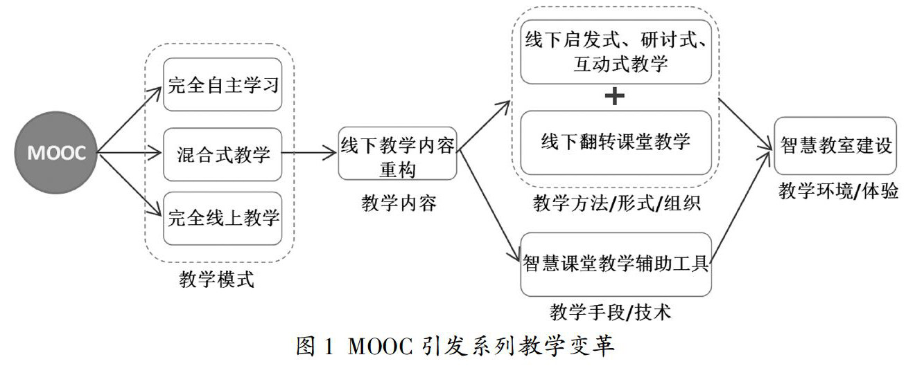 摘 要:MOOC撬动了作为人才培养核心要素“最后一公里”的课程建设,直接带动教学模式、教学方法、混合式教学和信息化教学改革、智慧教室建设等,引发了广泛的教育教学理念革新与教学变革行动,得到了广泛关注与积极参与,创造了史无前例的成就。文章论述了MOOC对教学变革的时代性作用,剖析了MOOC引发与带动的系列变革,重点对改革的连锁性、课程建设及教学改革与研究、基于MOOC的混合式教学模式和信息化教学走