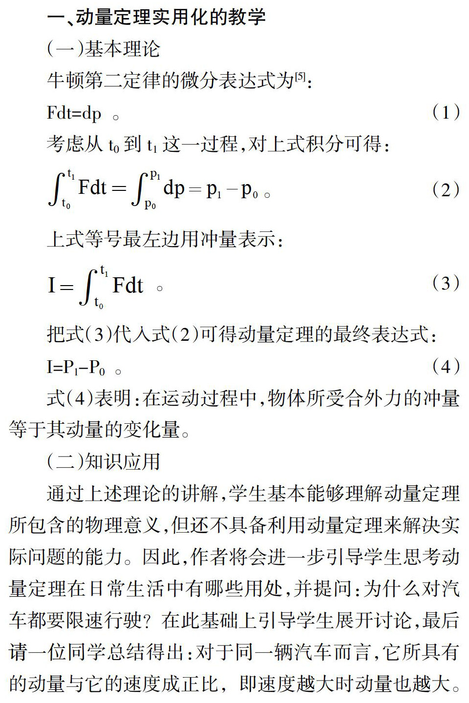 摘 要:结合生活中的实际事例,重点探究了如何把动量定理、质心运动定理、伯努利方程和全反射等理论知识实用化。实践结果发现,科学地把物理知识实用化不仅能激发学生的学习兴趣,提高其学习效率,还能培养学生学以致用的能力。 关键词:动量定理;质心运动定律;伯努利方程;全反射 中图分类号:G642 文献标志码:A 文章编号:2096-000X(2021)22-0091-0
