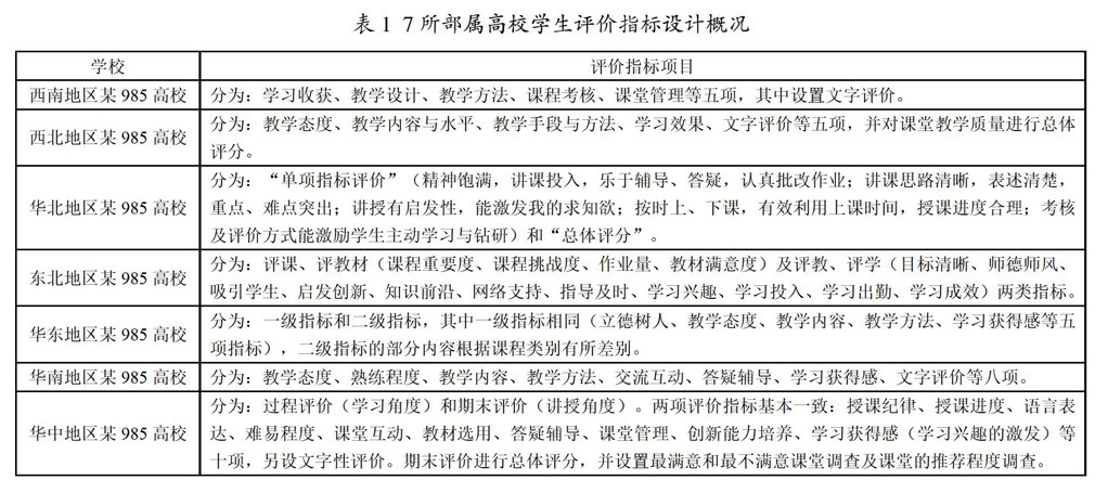 摘 要:文章评述了在我国“以本为本”的教育改革时期,国内部分高校对本科教学评价工作的实施和改进情况,并结合国内外部分高校在教学评价体系建设方面的相关经验,探究如何构建较为完善的高校教学评价体系。结合评价体系的构建、评价指标的设置、评价过程的实施及评价结果的反馈使用等提出一系列思考,促进教学评价与提升学习效果和推动教育教学改革深度融合。 关键词:教学评价体系;学习效果评价;学生评教 中图分类号