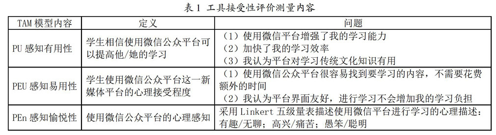摘 要:随着智能环境的到来,互联网+传统文化的翻转课堂教学模式成为我国传承优秀传统文化的重要手段。微信公众平台作为“互联网+”的重要体现,其传播功能、通讯功能、社交功能对传统文化课堂教学产生了较大影响。文章构建了以教学指标和接受性指标为模型的评价体系,分别采用修订的布鲁姆教育目标分析法、三维目标法和TAM模型,对使用微信公众平台进行传统文化课翻转课堂教学进行了教学效果性评价和工具接受性评价研究,