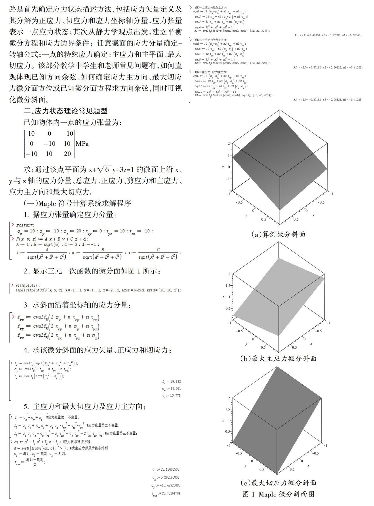 摘 要:文章按照国家建设“金课”要求,基于吴家龙教授编著的弹性力学教材内容和课程“三难”特点,以应力状态理论部分常见题型求解任意微分斜面应力矢量、正应力、切应力、主应力和应力主方向及最大切应力为例,分别应用Maple编制程序,再现弹性力学求解思维,解决学生数理求解难题;应用Matlab-GUI模块编制应力状态理论求解器,把繁琐抽象的力学公式和微分斜面结果进行图形可视化,使学生的抽象思维和力学思维