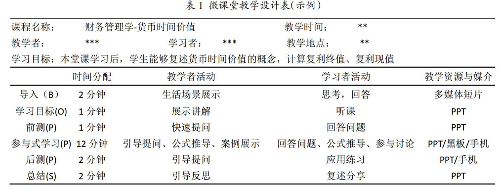 摘 要:基于对BOPPPS结构及其原理的解析,分析了其与“金课”建设的契合性,并结合实践教学经验,提出了教学理念转变、教学设计优先、教学流程规范、教学方法灵活的共性教学设计策略。以《财务管理学》中“货币时间价值”知识点为例,展示了基于BOPPPS结构的微课程设计,以期为当前以学生为中心打造“金课”的实践提供借鉴参考。 关键词:BOPPPS;“金课”;教学设计;财务管理学 中图分类号:G642