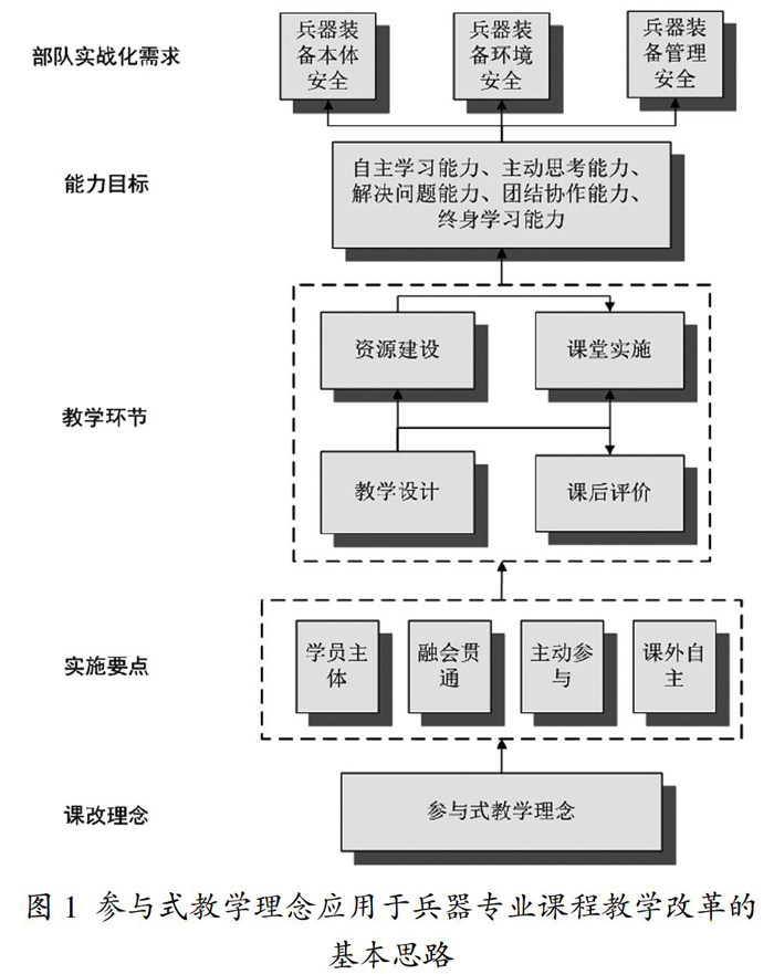 摘 要:新形势下的海军兵器专业的需求对人才能力培养提出了新的要求。为提高部队实战化条件下兵器装备保障人才的培养质量,以兵器专业课程教学为切入点,提出了能力为导向的兵器专业课程教学改革的整体思路,通过将参与式教学理念与海军兵器专业人才培养需求相结合,在兵器专业试点课程的教学设计、资源建设、课堂实施、课后评价等环节开展参与式教学改革实践,获得了良好的应用效果,提出了推广参与式教学方法的建议与措施。实