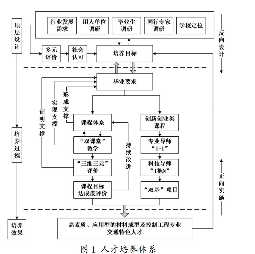 摘 要:紧贴轨道交通行业对材料成型及控制工程专业人才的需求,聚焦于“交通特色、轨道核心”的目标定位,为培养“高素质、应用型的材料成型及控制工程专业交通特色人才”,采用“反向设计、正向实施”的思路构建人才培养体系,实现了人才培养的闭环,形成了“多维渗透铸交通特色、政专时空融合促育人育能、立体科创提创新实践”的人才培养特点。 关键词:反向设计;正向实施;交通特色;育人育能;创新实践 中图分类号: