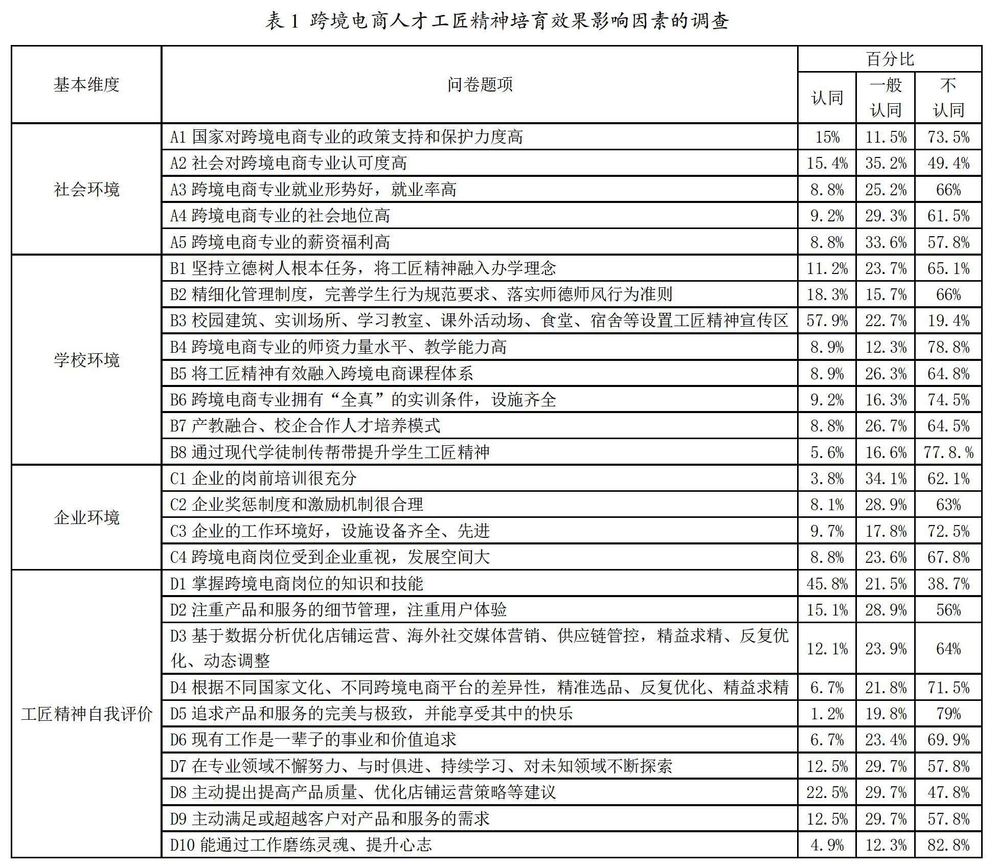 摘 要:基于社会环境、学校环境和企业环境3个维度,构建高职跨境电商人才工匠精神培育效果影响因素模型,探究工匠精神培育效果的影响因素。并得出以下结论:社会环境、学校环境和企业环境均对工匠精神培育效果具有显著的相关关系,其影响程度的排序依次为社会环境、企业环境和学校环境。文章最后针对性提出了高职跨境电商人才工匠精神培育的策略建议。 关键词:高职;跨境电商;工匠精神;影响因素 中图分类号:C961