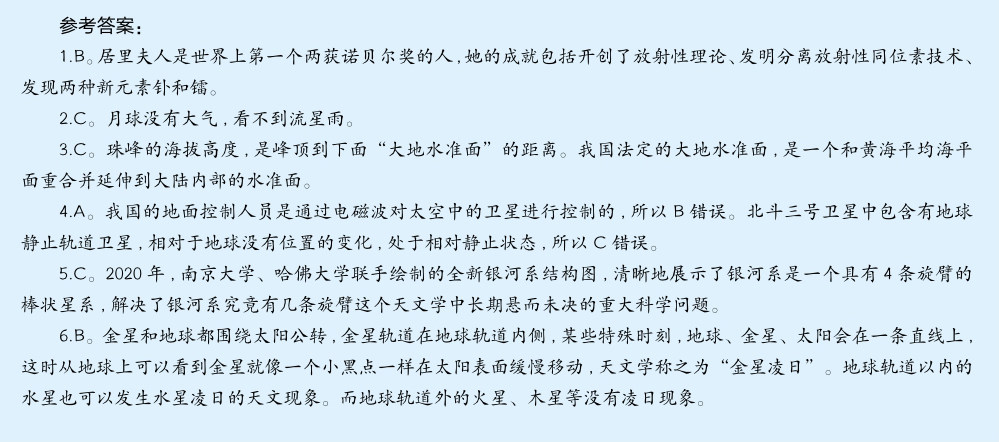 1.2020年11月,诺贝尔奖官方发布了一条科普公告,称居里夫人1899年至1902年间的实验室笔记本仍具有放射性,并将持续1 500年。下列哪种放射性元素不是居里夫人发现的? A.钋 B.铀 C.镭 2.2020年11月24日,嫦娥五号成功发射升空,顺利登陆月球进行为期两天的采样任务,中国向载人登月又迈出了一步。遨游太空是很多人的梦想,假如你长大后成为宇航员登上月球,以下哪个景象在月球上