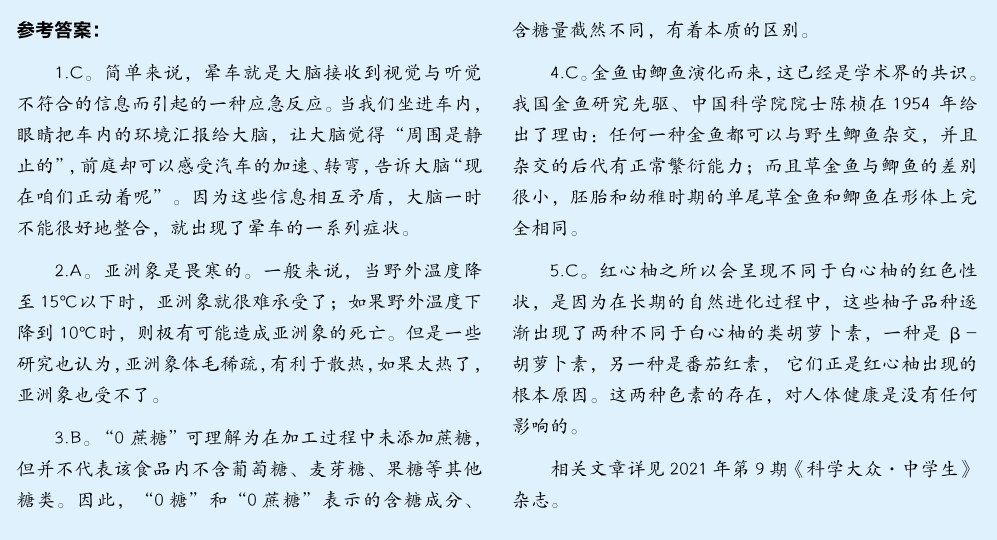 1.晕车是大脑接收到的哪两个感觉不符合的信息而引起的一种应急反应? A.视觉与触觉 B.触觉与听觉 C.视觉与听觉 2.2021年4月,原本生活在云南西双版纳自然保护区的若干亚洲象,经普洱、玉溪、昆明,一路向北,引起了人们极大的兴趣。关于亚洲象的特点,下列说法错误的是哪一项? A.喜寒 B.爱动 C.怕孤单 3.很多人以为“0 蔗糖”就是无糖,尤其是一些减肥人士,认为只要是“0蔗糖
