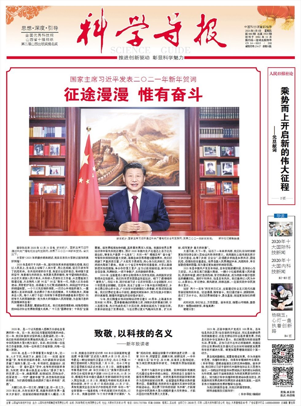 时光的脚步总是匆匆向前,不容你稍事休息,就奔向了2021年的征程。 2020年,突如其来的新冠疫情,让所有人的心都为之牵动;急剧变化的外部环境,让全球发展晦暗不明;受到严重冲击的国内经济,让每个人都感受到巨大压力…… 面对重重考验,我们向科学要方法要答案,交出了令人惊叹的答卷:中国科学家第一时间向全球共享病毒的全基因组测序结果,为全球抗疫提供了基础;5条技术路线15个疫苗进入临床试验,已有