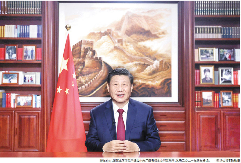 新华社北京2020年12月31日电 新年前夕,国家主席习近平通过中央广播电视总台和互联网,发表了二○二一年新年贺词。全文如下: 大家好!2021年的脚步越来越近,我在北京向大家致以新年的美好祝福! 2020年是极不平凡的一年。面对突如其来的新冠肺炎疫情,我们以人民至上、生命至上诠释了人间大爱,用众志成城、坚忍不拔书写了抗疫史诗。在共克时艰的日子里,有逆行出征的豪迈,有顽强不屈的坚守,有患难