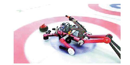 高峰供图 北京冬奥会冰壶项目赛场(冰立方)上,一位特殊“选手”现身。这位“选手”两个后“腿”蹬踏起踏器,两个中“腿”支撑身体,两个前“腿”当作双“手”控制冰壶的方向、移动与旋转速度,然后奋力一投,击中目标。