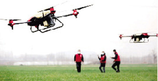 图为2月27日,枣庄市市中区税郭镇野岗埠村的工作人员使用植保无人机在麦田里喷洒除草剂。时下,山东省枣庄市210多万亩小麦进入喷施除草剂的关键时期。枣庄市组织专业服务队利用植保无人机等现代农业技术和设施消除麦田里的杂草,全力保障小麦丰收。 孙中喆摄