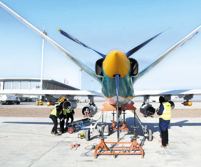 一月六日,我国拥有自主知识产权的人工影响天气无人机“甘霖-I”在甘肃省金昌金川机场首飞成功。据介绍,“甘霖-I”具备远距离气象探测能力、大气数据采集能力和增雨催化剂播撒能力,同时拥有防除冰能力,具备复杂气象条件下的作业能力。图为当日在金昌金川机场,技术人员开展人工影响天气无人机“甘霖-I”首飞前的准备工作。■ 新华社记者范培珅摄