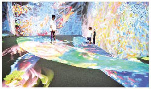 邵瑞摄 图为6月6日,小朋友在科技艺术节上的“teamLab Future Park”未来游乐园中体验交互动画。首届西安IN科技艺术节近日在西安市高新区举行,展览活动光影效果五彩绚烂、交互体验充满科技感,吸引许多家长带领孩子参观体验。