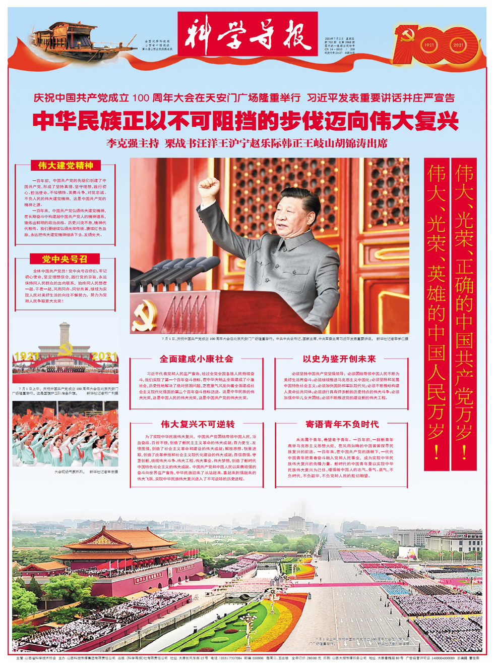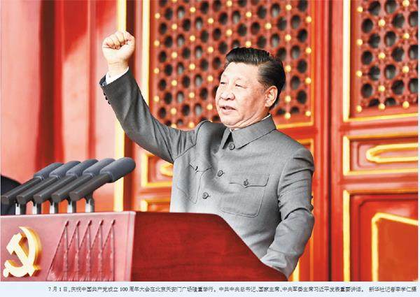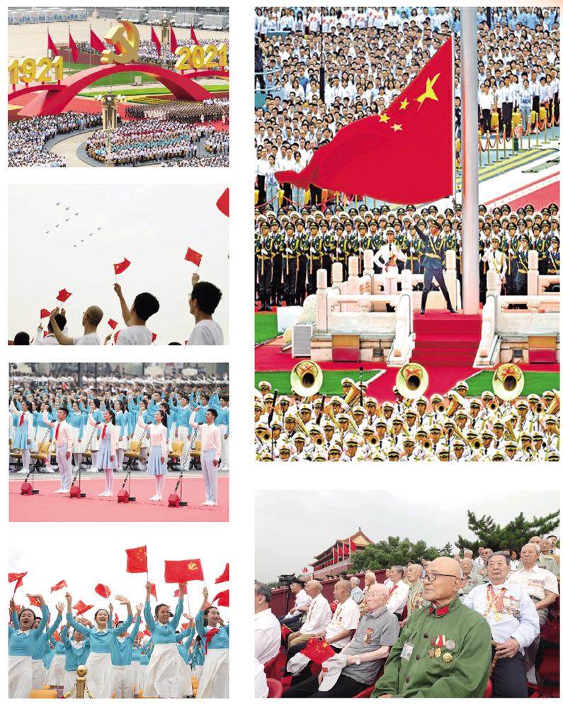 百年征程波澜壮阔,百年初心历久弥坚。7月1日上午,庆祝中国共产党成立100周年大会在北京天安门广场隆重举行,各界代表7万余人以盛大仪式欢庆中国共产党百年华诞。中国人民解放军71架战机振翅长空,100响礼炮响彻云霄,中国人民解放军联合军乐团奏响雄壮的《义勇军进行曲》,共青团员和少先队员代表集体致献词……城楼上下融通起真情交汇的心桥,广场内外汇聚成欢歌笑语的海洋,共同庆祝中国共产党百年华诞,共同祝愿祖
