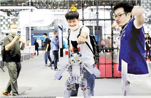 方喆摄 7月8日,参观者在展会现场体验体感机器人玩具。当日,2021世界人工智能大会在上海开幕。本届大会的主题是“智联世界 众智成城”,设会议论坛、展览展示、竞赛评奖、应用体验等活动,超过300家企业的众多前沿人工智能技术与产品集中亮相。