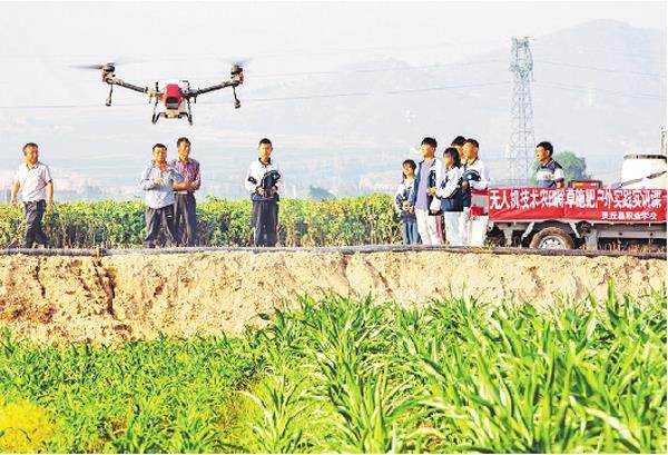 王中勋摄 7月2日,在大同市灵丘县黑龙河村农田里,灵丘县职业学校无人机专业班的学生们在老师的指导下进行喷药作业。灵丘县职业学校与灵丘县禾田农业公司合作,在解决学生校外实训的同时,为农户喷洒农药2.8万亩。