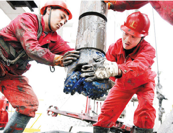 近年来,为进一步提高气田采收率和产量,涪陵页岩气田优选焦石坝区块的焦页66号扩平台作为开发试验平台,尝试对上、中、下三层气层进行精细开发,相当于把地下井网由“二层楼”变成“三层楼”,最大程度提高储量动用率和页岩气产量。图为涪陵页岩气田钻井平台员工操作下钻施工。