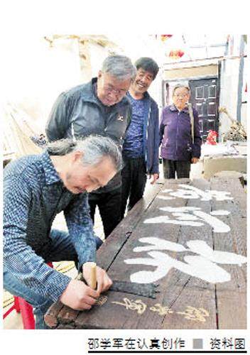 铺开八尺宣纸,脱掉鞋,操起特制笔,饱蘸墨,虚握拳,平呼吸,提、按、顿、挫,扭拧千毫风尘现,搅得流云滚滚来……顷刻间,厚重凝练的“含得”二字跃然纸上!“舍”字头起笔“人”像慷慨姿意给予,“得”字落笔之“寸”似快乐跳跃,意蕴立现。 7月31日,《科学导报》记者见到了60岁的邵学军,此时他正准备写字,长发飘飘,字与书者皆让人感慨潇洒神奇。他告诉记者:“写小楷,用指力;写大楷,用腕力;一尺榜书,用肘