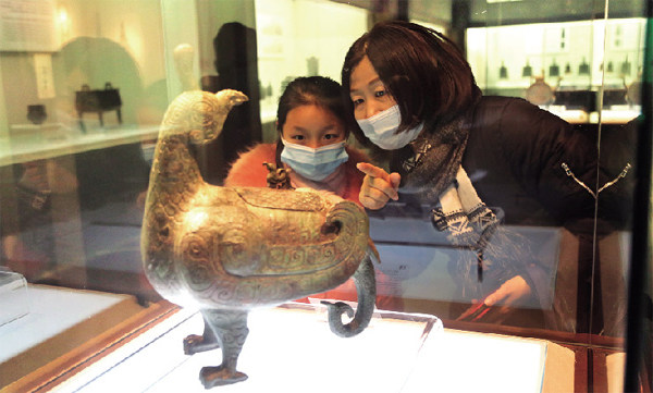 1月22日,一位市民正在山西博物院“鸟尊”前为孩子讲解与鸟尊相关的科普知识。进入寒假以来,许多家长带着孩子走进博物院,用实物传递知识,让孩子近距离“触摸”和“感受”历史,激发孩子学习历史的兴趣,引导孩子去思考,开拓孩子的历史人文视野。