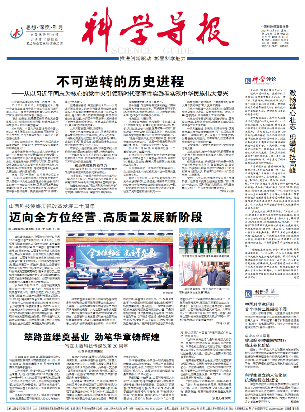 从2001年到2021年,筚路蓝缕启山林,科技传媒改革栉风沐雨砥砺前行;从2001年到2021年,劲笔华章担使命,科技传播发展乘风破浪高歌猛进。 二十年春秋,沧海一粟;二十载岁月,人生青春。时光扑面而来,浓缩20年刻骨记忆:从一报一刊19人的山西科普报刊社,到三报八刊九个子公司近300人的山西科技传媒集团,悠悠岁月,铮铮誓言,“让科学点亮生活”,就这样凝固在了那些纸张、那些画面和那些赞许中…
