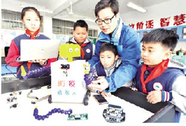 近日,在浙江省湖州市长兴县实验小学机器人实验室,师生正在调试防疫机器人。长兴县实验小学师生创客团队运用3D打印、物联网编程等科技手段自主研发防疫机器人,搭载体温自动监测预警、防疫知识智能播报等功能,助力校园防疫,确保师生安全。