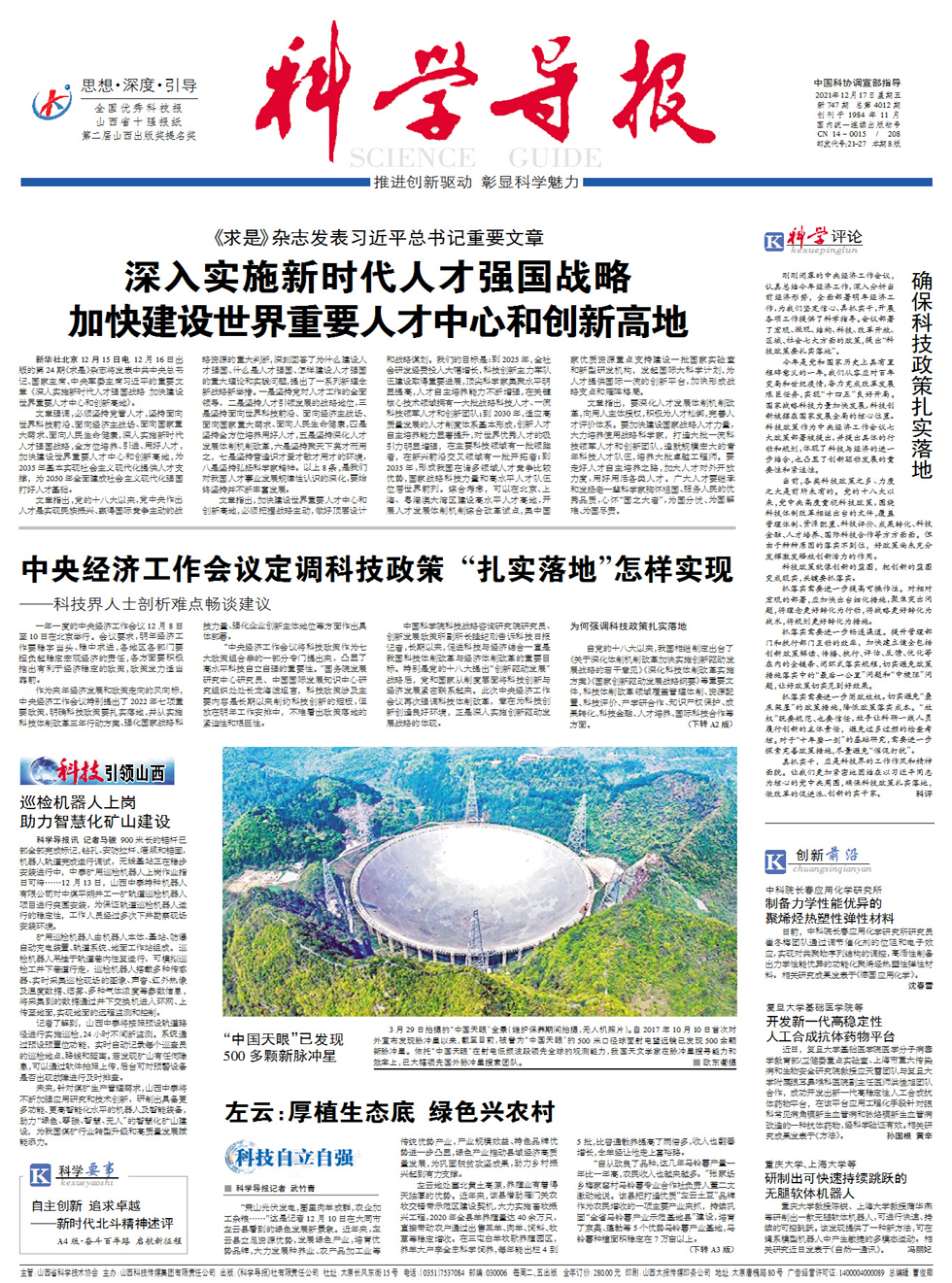 刚刚闭幕的中央经济工作会议,认真总结今年经济工作,深入分析当前经济形势,全面部署明年经济工作,为我们坚定信心、真抓实干,开展各项工作提供了科学指导。会议部署了宏观、微观、结构、科技、改革开放、区域、社会七大方面的政策,提出“科技政策要扎实落地”。 今年是党和国家历史上具有里程碑意义的一年。我们从容应对百年变局和世纪疫情,奋力完成改革发展艰巨任务,实现“十四五”良好开局。国家战略科技力量加快发
