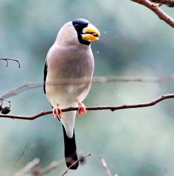 走在冬季的公园里,有时会看见在树木最高的枝杈上停着形如麻雀的小鸟,如果随身带着望远镜,请别轻易错过它。目镜中,你以为是普通麻雀的小鸟很可能摇身变成一只戴着黑头套的侠客——蜡嘴雀! 有请蜡嘴雀家族的侠客闪亮登场! 戴头套的蜡嘴侠客 黑头侠——黑头蜡嘴雀 黑头蜡嘴雀是一种胖墩墩的雀科小鸟,粗壮、蜡黄的嘴巴和从头罩到脖颈的黑色面罩让它们尽显萌态。 黑头蜡嘴雀的体长约20 厘米,在雀科鸟