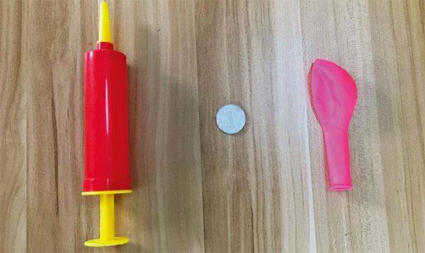 吹完气球后,为了防止漏气,我们都会在吹气口打个结。不过,这样一来,气球基本上就不能重复使用了。 有没有什么办法既能不打结又能不漏气呢? 其实一枚小小的硬币就能搞定。 这听起来似乎不可思议,但是运用物理思维,让硬币借助神奇的大气压就不难办到。我们一起来看看吧! 实验材料 打气筒,一元硬币,气球。 实验步骤 1.将硬币放入气球内。 2.用打气筒打气。 3.接下来,将吹