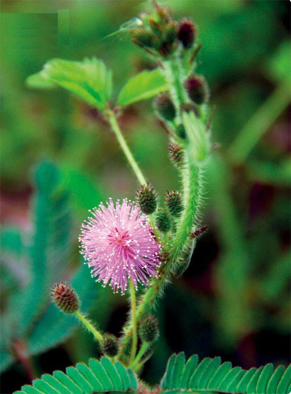 植物不像动物,拥有完善的神经系统和肌肉组织,所以一般不会对外界刺激做出明显的反应。 然而,含羞草(Mimosa pudica Linnaeus)却与一般植物不同:只要轻轻一碰,它就会“激动”地垂下叶柄,小叶子也纷纷闭合起来。 叫草却并不像草 茎 含羞草的名字里有个“草”字,但它的形态却完全没有草的样子,而是灌木状的。含羞草的茎为圆柱状,并且有很多分枝,茎上长满钩刺和刺毛。 花