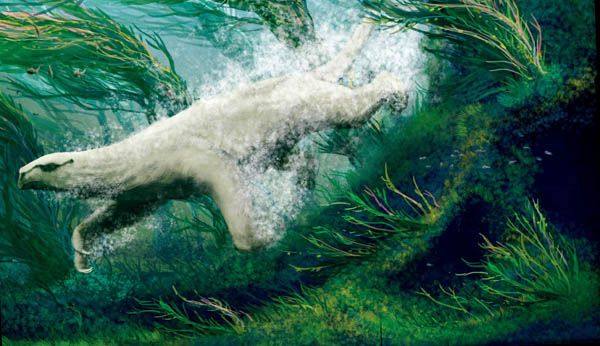 500万年前,今天秘鲁的西海岸被温暖的海水包围着,如今铺满黄沙的土地那时长满绿色的海藻。鱼虾在海藻中穿梭,寻找着食物。突然,一个黑影出现了,鱼虾纷纷四处逃窜。海懒兽也来享受这片温暖的海水了。 海懒兽张开四肢,缓慢地游动着,它用前肢上的大爪子抓住海底的岩石,将自己的整个身体拉到海底,然后低下头,开始啃食海藻。它不停地用爪子将海藻抓到嘴巴边。 大概过了10分钟,海懒兽打算到海面上缓口气,于是仰