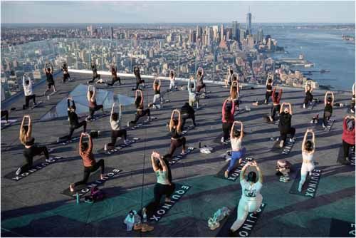 2021年6月17日,曼哈顿,瑜伽练习者在345米高的观景台上课 在传统上,印度知识通过“古儒—徒弟”(Guru-Shishya)的师徒制度传授。印度的学生较为顺服,对老师不合理的要求大多逆来顺受,即便是在现代的大学里,这套文化也依稀存在。 而瑜伽这门古老技艺的传授,更是依循这样的传统,向来由徒弟向古儒直接学习,过程中也得忍受各种近乎虐待的无理要求。瑜伽在西方风行,首先要克服的障碍,就是这个传