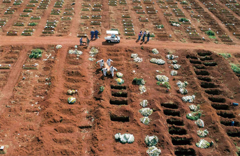 2021年4月7日,圣保罗,身穿防护服的工作人员安葬新冠死者。近日,巴西新冠肺炎死亡人数激增,最大城市圣保罗正加快旧墓的清理工作,该市将挖掘1056具遗体,为新冠肺炎死者腾出空间。图/Andre Penner 尼泊尔 2021年4月10日,加德满都巴克塔普尔镇,人们参加尼泊尔传统新年庆祝活动,合力拉动一辆载着神像的巨型木质战车。图/Prakash Mathema