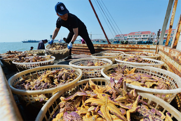 渔民在青岛红岛渔港码头收购海星。图/IC photo 泛滥的海星 下午两点的码头最是喧闹。“水里的(暗)流多了,不方便出海捕捞。”红岛人习惯这么解释潮汐的变化。刚把船靠岸的潜水员在岸边洗了把脸,便匆匆上岸转动塔吊。塔吊的一端连着钩子,吊上来满满一桶海星。尚留在渔船上的另一名潜水员也趁势拉着吊桶一同上了岸。 一个吊桶能装三百多斤。当日海里有大流,陈世良的这条渔船只捞上来一千多斤海星。塔吊移