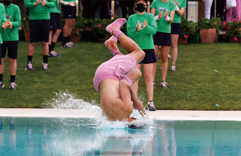 2021年4月25日,巴塞罗那网球公开赛决赛,西班牙选手纳达尔击败希腊选手斯特凡诺斯·齐齐帕斯夺得男单冠军,赛后他跳入泳池庆祝。图/Josep Lago 巴勒斯坦 2021年4月26日,加沙地带,巴勒斯坦警察在毕业典礼上展示技能。图/ Mahmud Hams