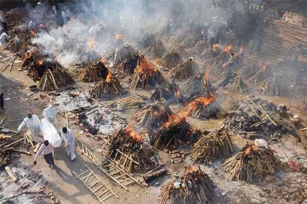 4月26日,印度新德里,殡仪馆为新冠肺炎遇难者举行火葬。图/人民视觉 Anurag Rana 4月23日,印度首都地区德里东部,一处简陋的火化场内,十几簇明亮的橙色火焰正凶猛地摇晃着火舌,消逝中的生命之火似乎要使出最后一丝力气,刺穿那黯淡而绝望的夜幕。火焰周围是更多即将燃尽的骨灰和木柴的灰烬。包裹着白布的尸体仍在被不断抬进这座垃圾遍地的火化场,等待被露天焚烧。抬尸体的几十人里,只有零星几个穿着
