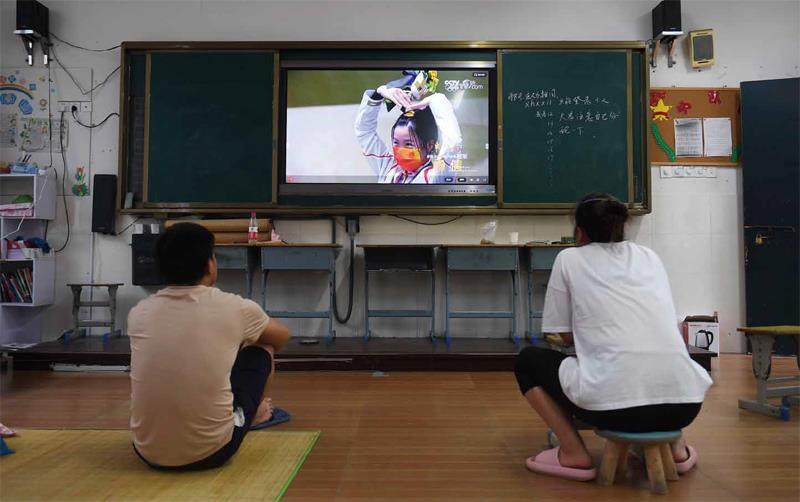 7月24日,台州,两名外来务工人员在安置点内观看中国选手杨倩摘得东京奥运会首金。当日,今年第6号台风“烟花”临近浙江,台州市三门安置点内,众多安置转移人员观看东京奥运会。图/王刚 美国 7月24日,加利福尼亚州,迪克西大火(Dixie Fire)持续蔓延,空气遭遇严重污染,两个邻居在启程撤离前相互拥抱。图/Josh Edelson 泰国 7月20日,曼谷,大量闲置的出租车停在停车场中。受新