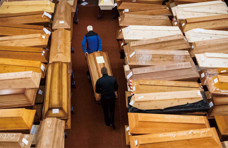 2021年1月13日,德国东部麦森,新冠肺炎疫情期间,当地的火葬场正在努力应对死亡人数的激增,棺材最高可堆叠三层,甚至被存放在走廊里等待火化。德国疾控机构14日公布的新增新冠病死人数再度创下该国疫情暴发以来新高,达到1244人。图/人民视觉 四川 2021年1月16日,成都音乐产业中心的负一层,一位年轻人在车库内练习钢琴。四川省2021年普通高校招生音乐类专业统一考试正在川音举行,各地考生抓紧