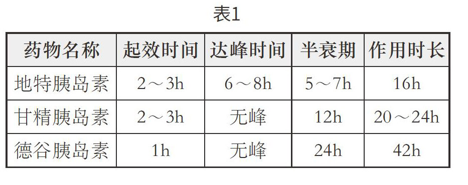 注射胰岛素是糖尿病的治疗手段之一。目前,胰岛素的种类有很多,不同类型的胰岛素治疗作用和使用方法都不相同。下面就一起来看看,临床中常用的3种长效胰岛素(地特胰岛素、甘精胰岛素、德古胰岛素),它们各自都有哪些特点。 首先来看药物的作用时间,见表1(表中h是小时的英文缩写)。 从表1我们可以看出,地特胰岛素持续时间小于24h,每天注射2次才能维持基础血浆胰岛素水平,且它作用峰值明显,夜间低血糖危险性