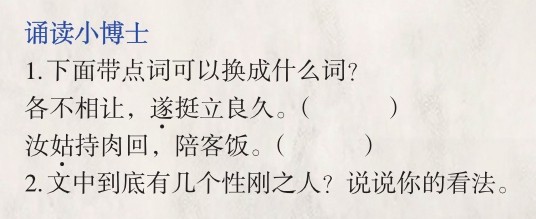 有父子俱性刚,不肯让人。一日父留客饮。遣①子入城市②肉。子取肉回,将出城门,值③一人对面而来,各不相让,遂挺立良久。父寻至见之,谓子曰:“汝④姑⑤持肉回,陪客饭。待我与其对立在此。” ——选自《明清笑话集》 注释:①遣:派,让……去。②市:买。③值:正巧。④汝:你。⑤姑:姑且,暂且。 译文:有一对父子性格都非常倔强,与人交往不肯礼让。有一天父亲留客人在家吃饭,让儿子到城里去买肉。儿子买了肉回